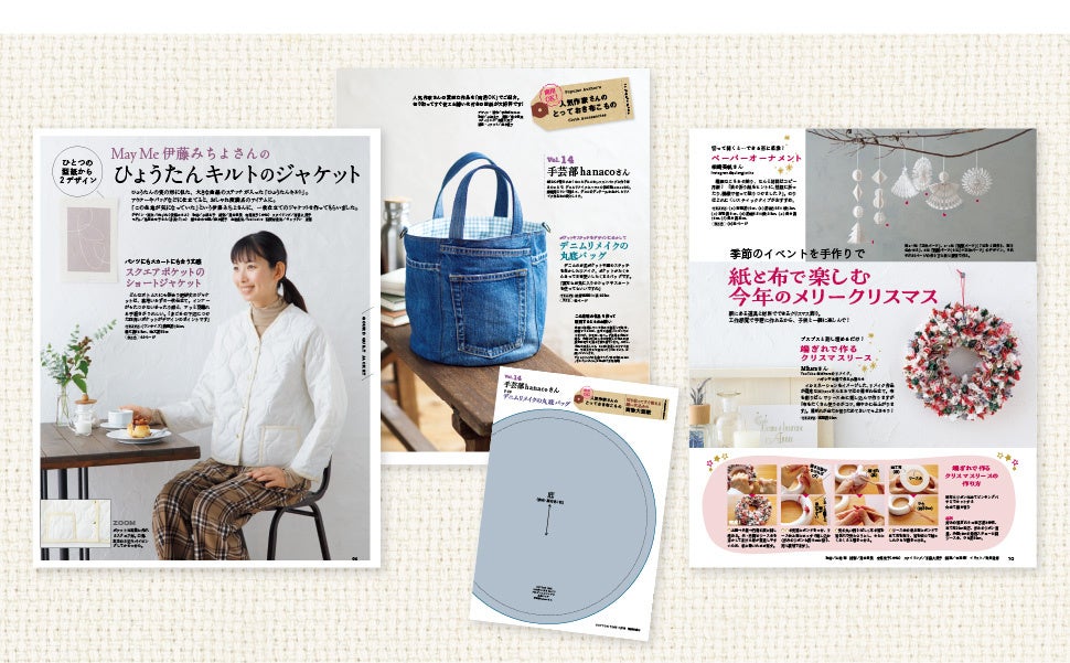 曲線ステッチの「ひょうたんキルト」を、May Me 伊藤みちよさんがおしゃれなジャケットに。ショート&ロングの2つの丈にアレンジ。大好評連載「商用OK!人気作家さんのとっておき布こもの」は手芸部hanacoさんのデニムリメイク作品。恒例のクリスマス企画は「紙と布」で、子供と一緒に楽しめるアイデアがいっぱい。