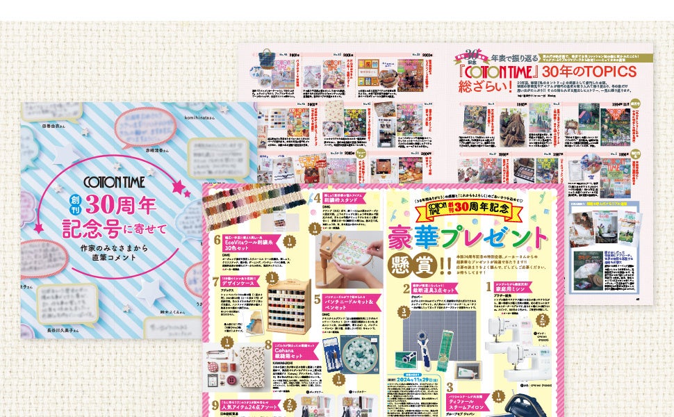 創刊30周年号企画も大充実! ミシンやアイロン、豪華手芸アイテムが抽選で当たる豪華プレゼント懸賞は、応募期間2024年10月4日~11月29日(はがき必着)。本誌綴じ込みの愛読者はがきでのみ応募できます。作家さんが直筆で寄せてくださった寄せ書きコメントや、30年分のTOPICSを総ざらいした読み物企画も必見です。