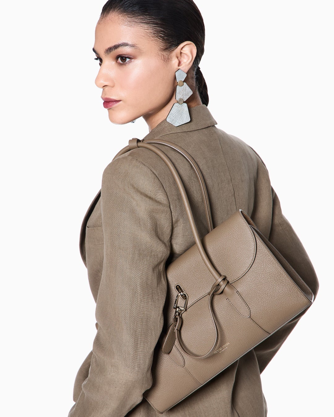 新たに加わったショルダーバッグは、しなやかなペブルドカーフスキンを用い、優れた収納力と実用性を備えたデザインに仕上げました。横長のフォルムが生み出す端正なバランスに、ダブルチューブハンドルとスナップボタン付きストラップを組み合わせることで、機能性と美しさを自然に融合。開閉にはメタルのスナップフックとリングをあしらい、ミニマルな佇まいの中にさりげない個性を添えています。