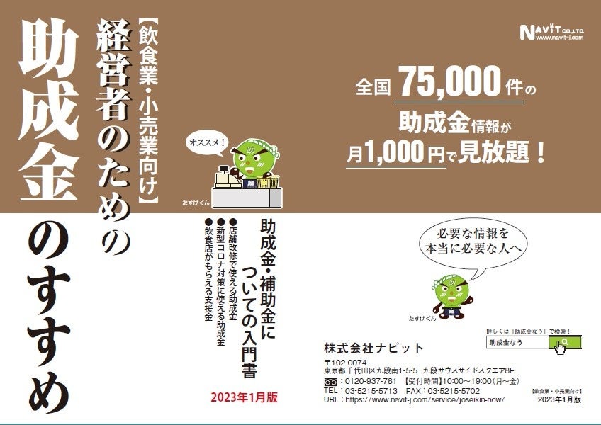 株式会社ナビット(東京都千代田区九段南、代表取締役:福井泰代)が運営する「助成金なう」では、2022/1/23(月)より、【飲食業・小売業向け】助成金小冊子「経営者のための助成金のすすめ」23年1月版をリリースしたので、お知らせします。