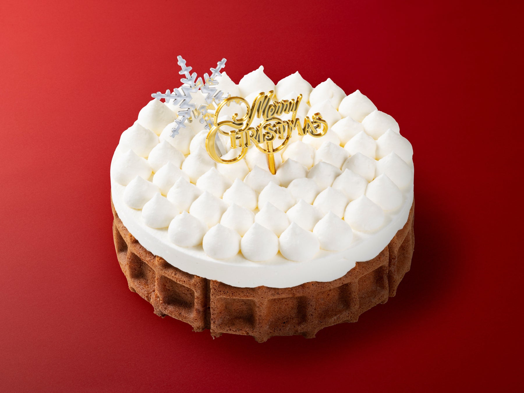 雪景色をイメージし、ホイップクリームでデコレーションしたワッフルのクリスマスケーキ。プレーン味のスポンジケーキの上に、桃ジャム入りのカスタードクリーム、黄桃の果肉、ホイップクリームを重ね、ふんわり焼き上げたチョコ生地のワッフルを側面に巻きました。