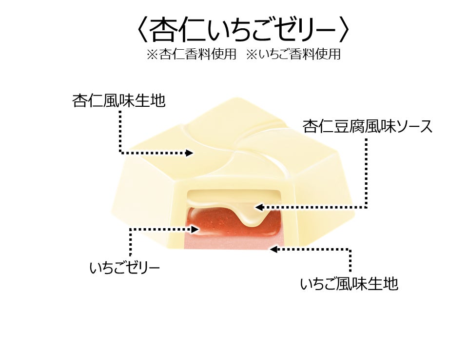 ソースで杏仁豆腐のとろっとした食感、いちごゼリーでぷるっとした果肉感を再現し「とろっ、ぷるっ」のW食感が楽しめます。杏仁豆腐の甘さといちごゼリーの酸味が見事にマッチした味わいとなっています。