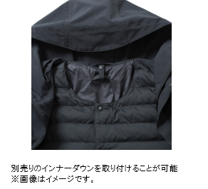 撥水機能のあるナイロン素材、耐水・防風に優れた特殊なフィルム、トリコット素材の3層の生地を使用した高機能パーカーです。インナーダウンを取り付けることで冬まで活躍します。