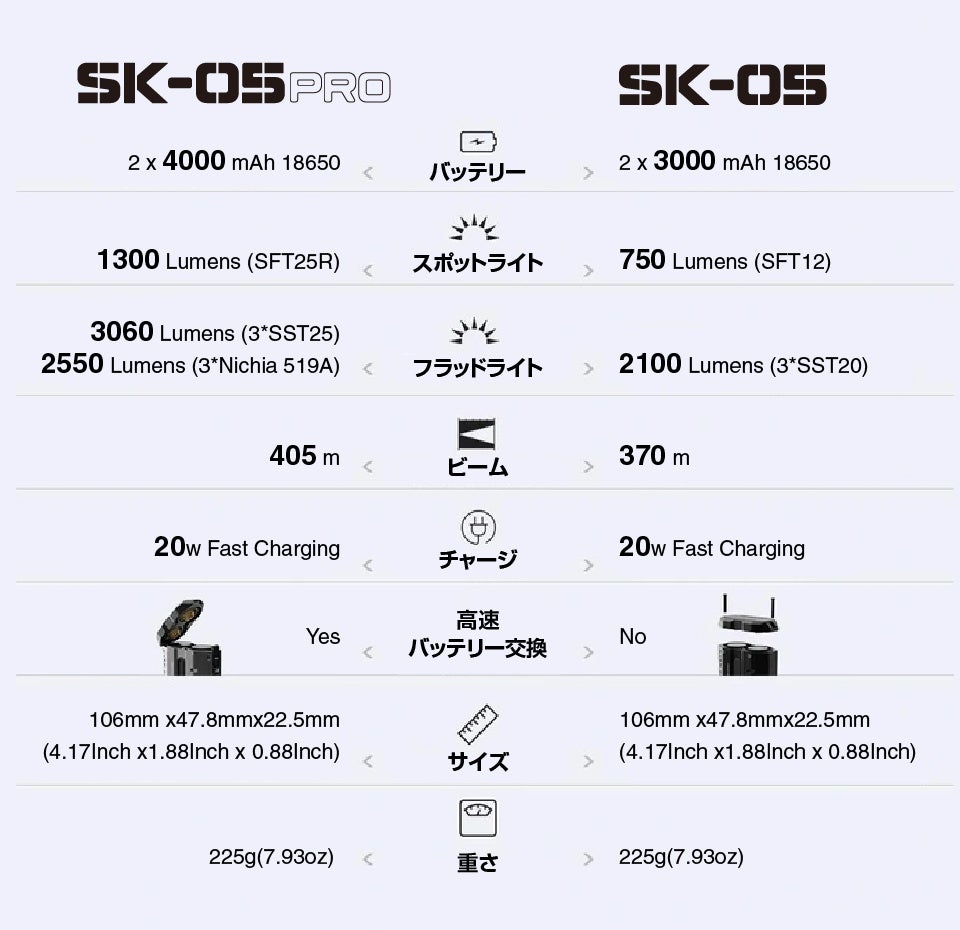 SK05 Proは最大405メートル先まで、SK05は最大370メートル先までビーム(光)を強力に照らすことができます。また広範囲を均一に照らせるフラッドライト機能では、最大出力3060ルーメンを放出するため、建築現場や駐車場、キャンプなど広いエリア全体を見渡したい場面で活躍します。