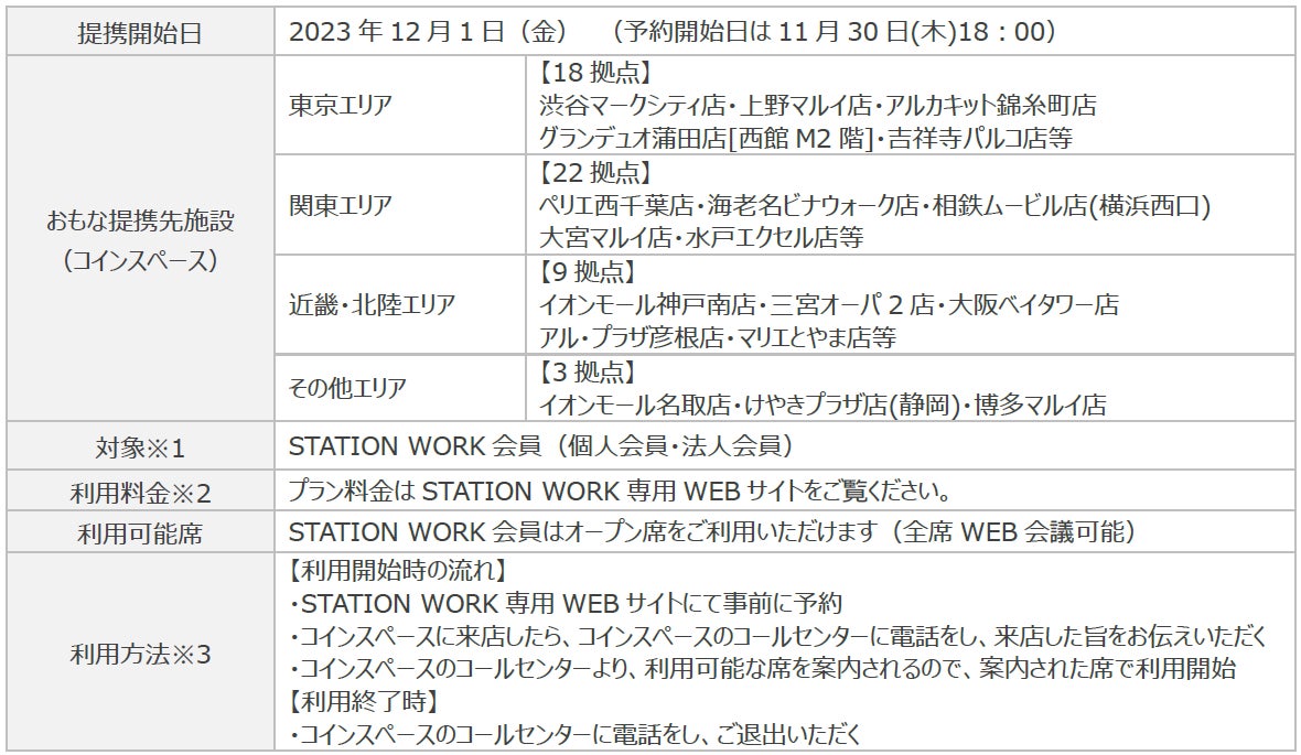 「STATION WORK」は「コインスペース」との提携を開始します~商業施設などにあるワークスペースが52拠点増えます!~
