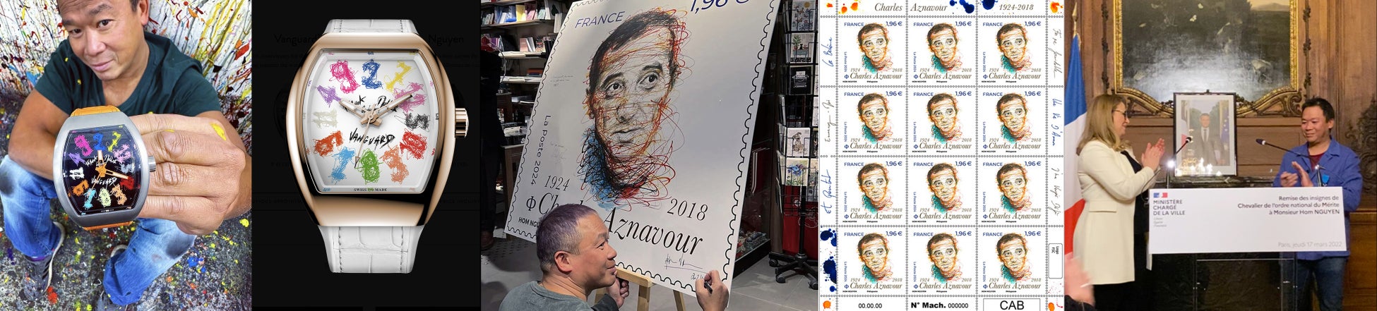 ホム・グエンは、キャンバス上で巧みに筆を振るい、刺激的な具象画や肖像画を描くアーティストです。フランスの国家公労勲章騎士の受章をしたほか、シャルル・アズナブール生誕100周年を祝うフランス郵便局のコレクターズ切手制作、「フランク ミュラー」とのコラボレーションウォッチを発売するなど、フランスを代表する芸術活動をしています。