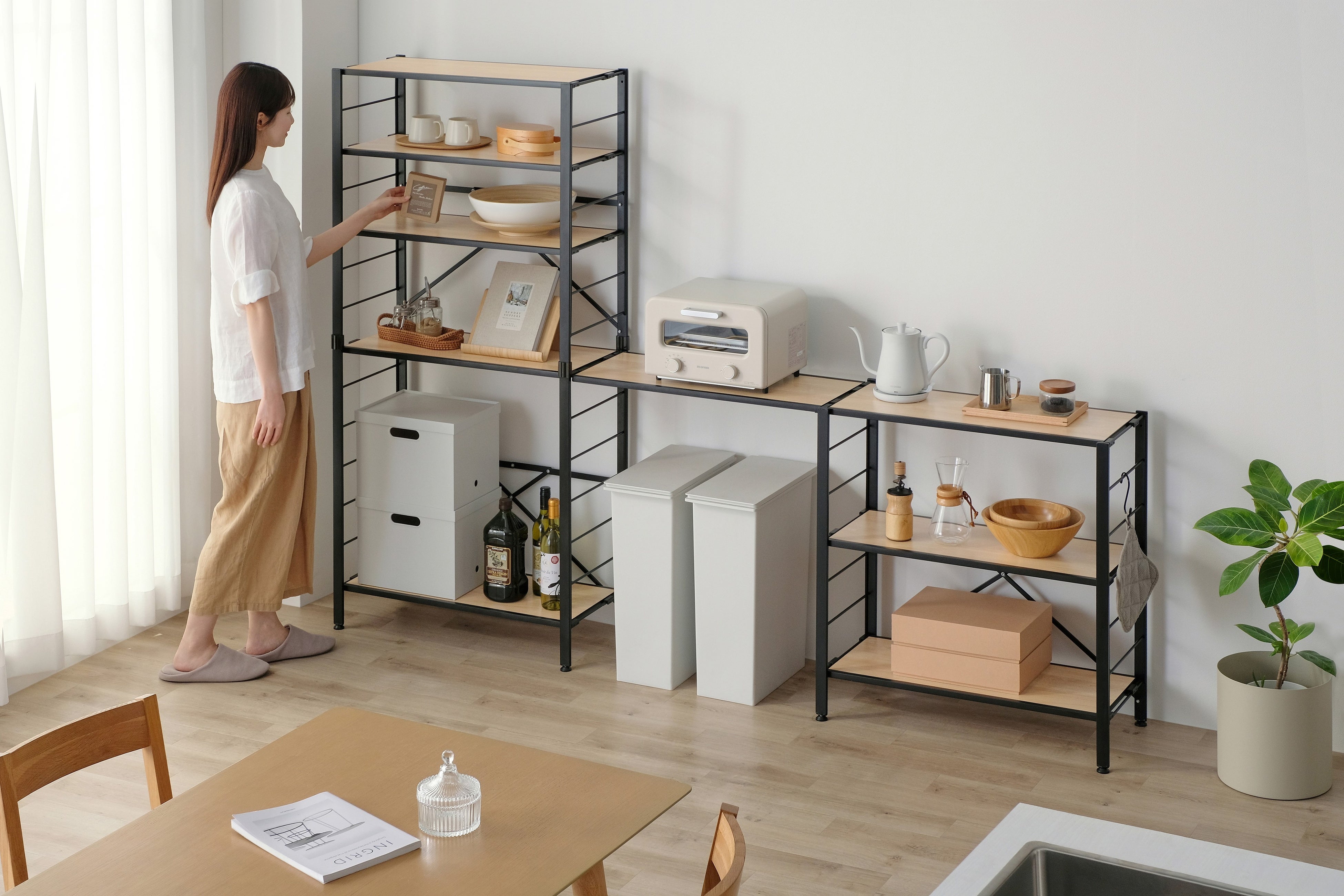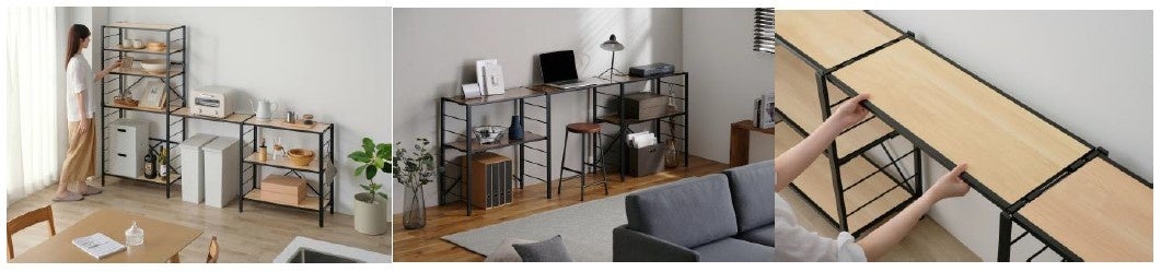 今回発売する「組立簡単 連結スチールラック」は、2つのスチールラック間に棚板を設置して連結(※4)できるため、リビングや寝室での収納に利用できるだけでなく、ゴミ箱上ラックとしてのキッチン収納や簡易作業台など生活スタイルに合わせた組み合わせを自由に選べます。3段タイプと5段タイプの2種類を品揃えし、5段タイプは5段ラックだけでなく、2つに分割してローラックとしても使用できます。また、3段タイプと5段タイプの棚板の高さを合わせられるため、組み合わせた時の統一感を保ちながら収納スペースを増やせます。