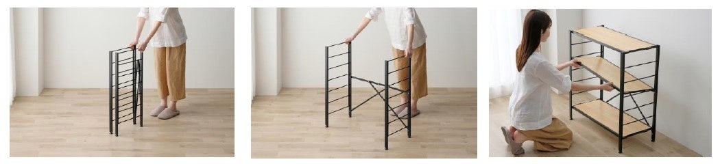 フレームを左右に広げ、棚板を取り付ける2つの工程だけで、工具を使わず(※5)簡単に組み立てられます。棚板は1段約11㎝の間隔で高さを調整できるため、収納ボックスや小物などの高さに合わせてレイアウトできます。奥行が約34.5㎝と広く、文庫本や単行本を2列並べて収納できます。また、耐水性に強いメラミン化粧板を採用しているため、油汚れや食べこぼしなどの汚れを落としやすく、液体が棚板に染み込むのを防げるので、調理台としても使用できます。