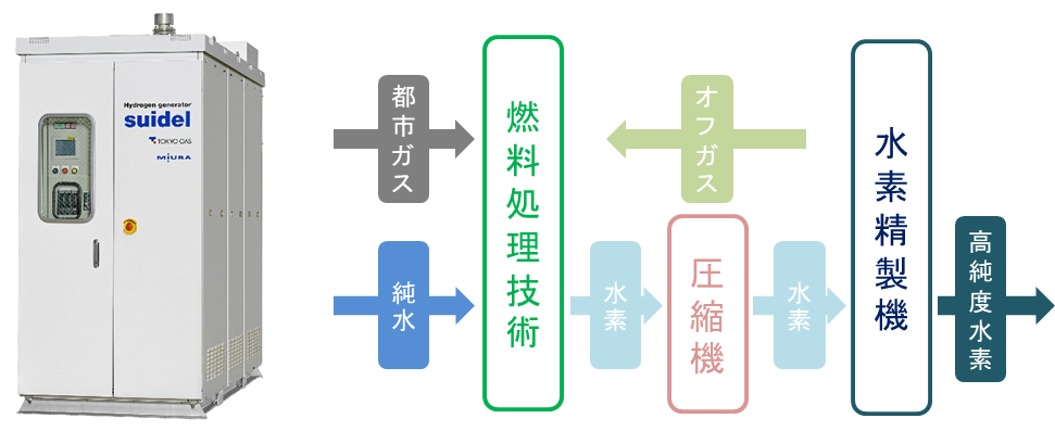 ・水素精製機や圧縮機が搭載され、0.8 MPa以下の高純度水素(99.99 vol%以上)を供給