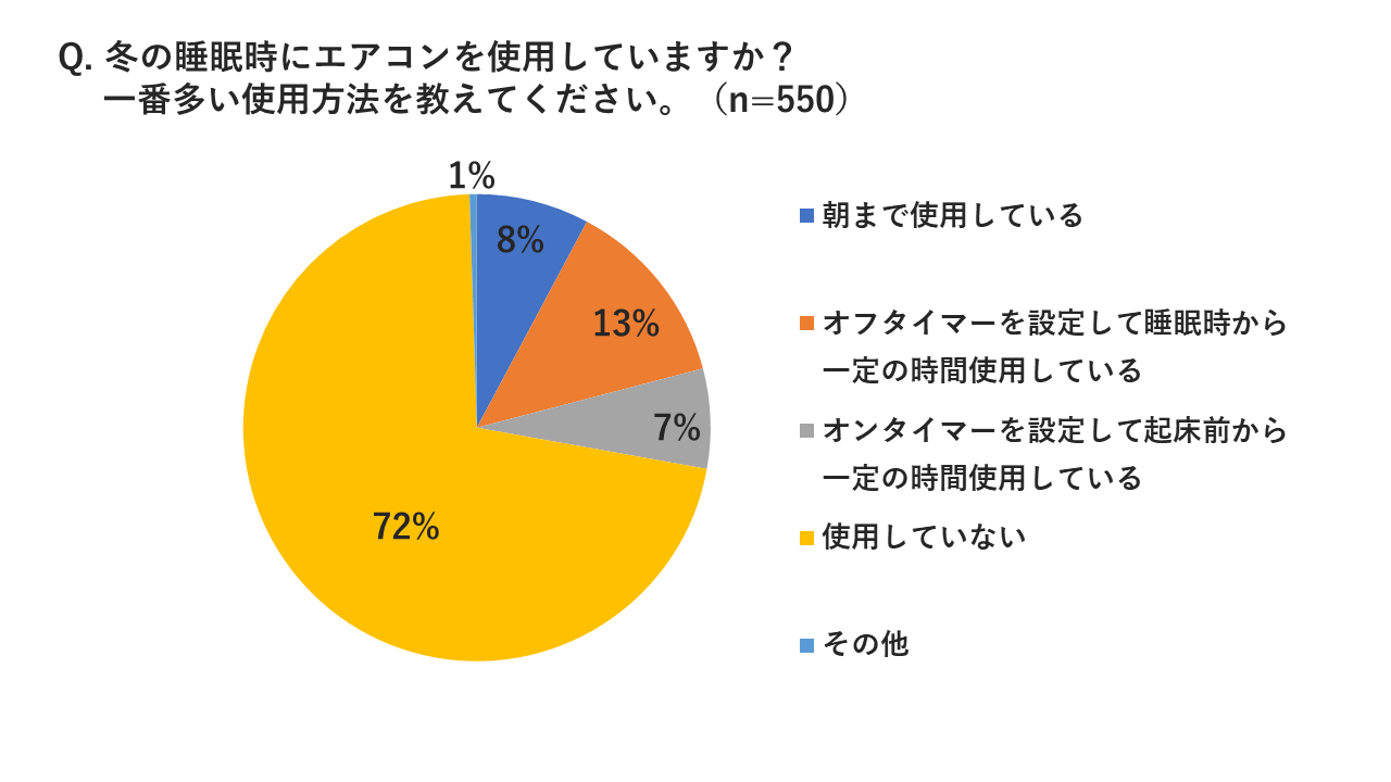 しかし、冬の睡眠時のエアコン使用率は28%と、寒さなどが原因で睡眠の質が下がると感じているにも関わらず、エアコンを使用していない人が多数いる現状が浮き彫りになりました。