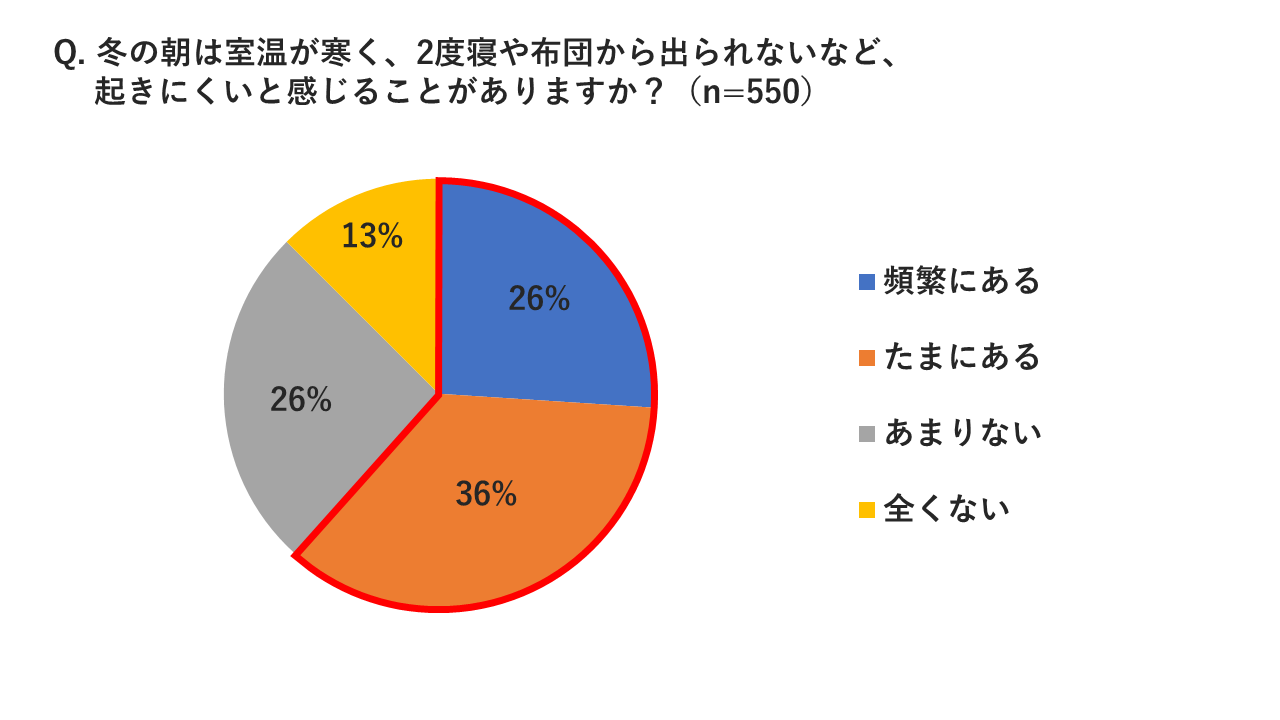 また、「冬の朝は室温が寒く、2度寝や布団から出られないなど、起きにくいと感じることがありますか?」という寝起きに関する質問では、同じく6割の方が「ある」と答えています。