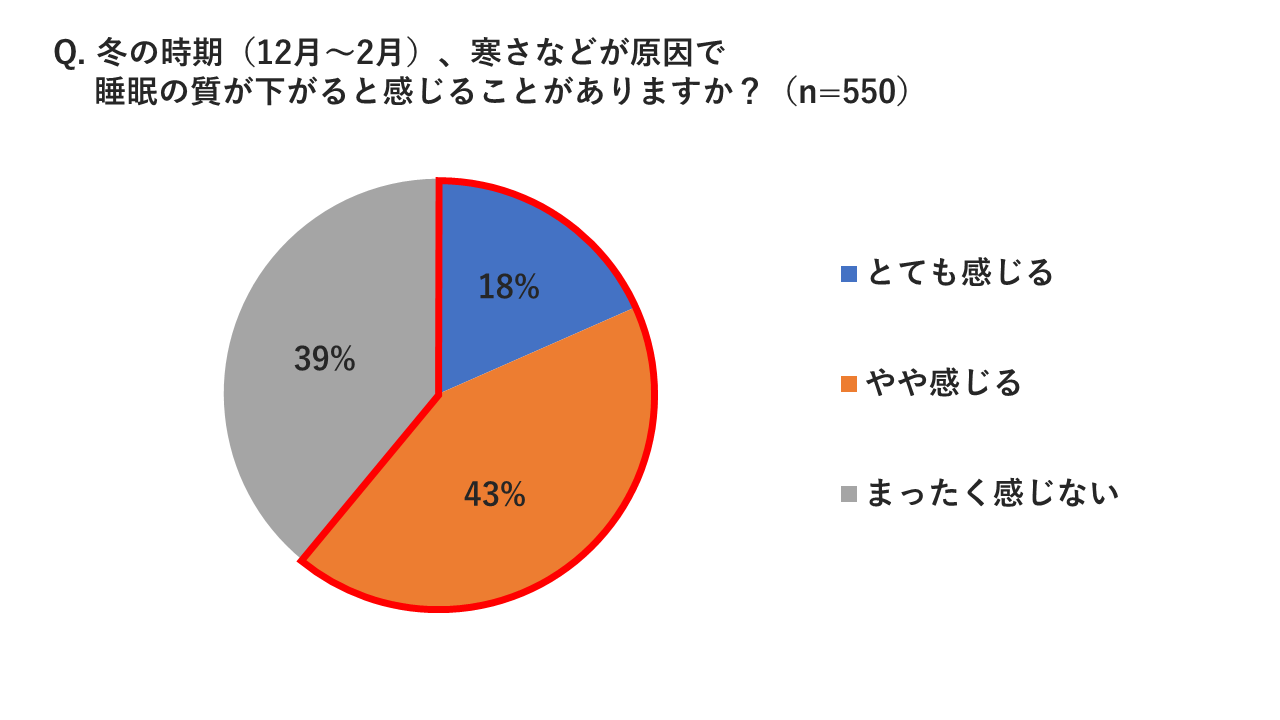 「冬の時期(12月~2月)、寒さなどが原因で睡眠の質が下がると感じることがありますか?」という質問では、約6割の人が「寒さなどが原因で睡眠の質が下がると感じる」ことが判明しました。