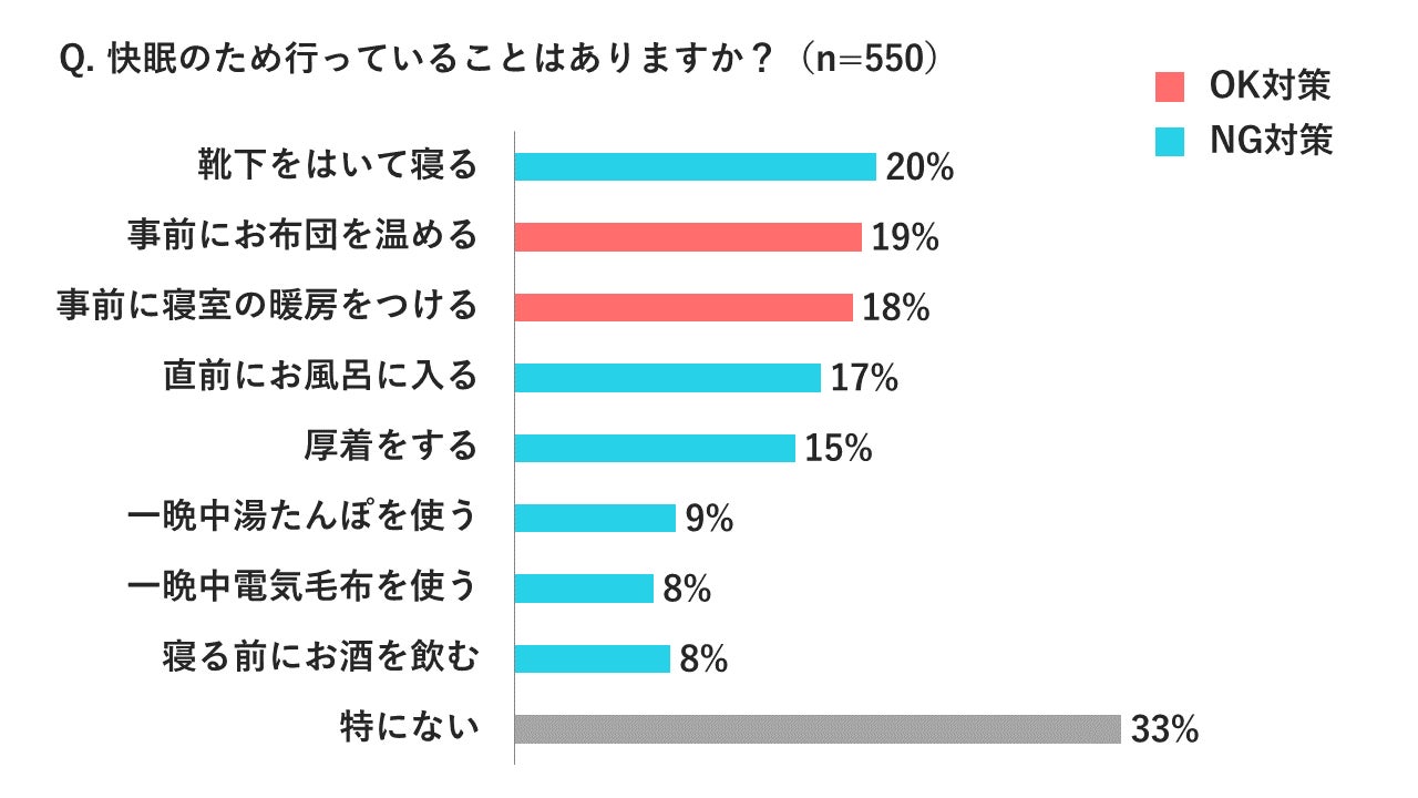 特に女性は、「冬は足が冷えるので靴下を履いて寝ている」という人も多いのではないでしょうか。調査の結果、実に20%もの方が実践している最もオーソドックスな冷え対策ですが、実はこれは快眠にとっては間違いです。深部体温を下げるには手足の毛細血管からの放熱が重要なのです。靴下を履いてしまっていては、足からの放熱ができずに、深部体温が下がりにくくなり、眠りづらくなります。就寝前には履いていても大丈夫ですが、ベッドや布団に入る際には脱いでおきましょう。