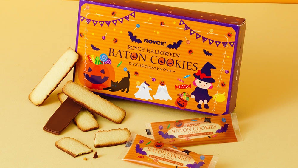 ローストしたココナッツが香ばしい、さくさくとした食感のクッキーの片面に、まろやかなチョコレートをコーティングしたバトンクッキー[ココナッツ]をハロウィン限定のパッケージでご用意。幅広く愛される定番人気の味わいは、ハロウィンパーティにもおすすめです。