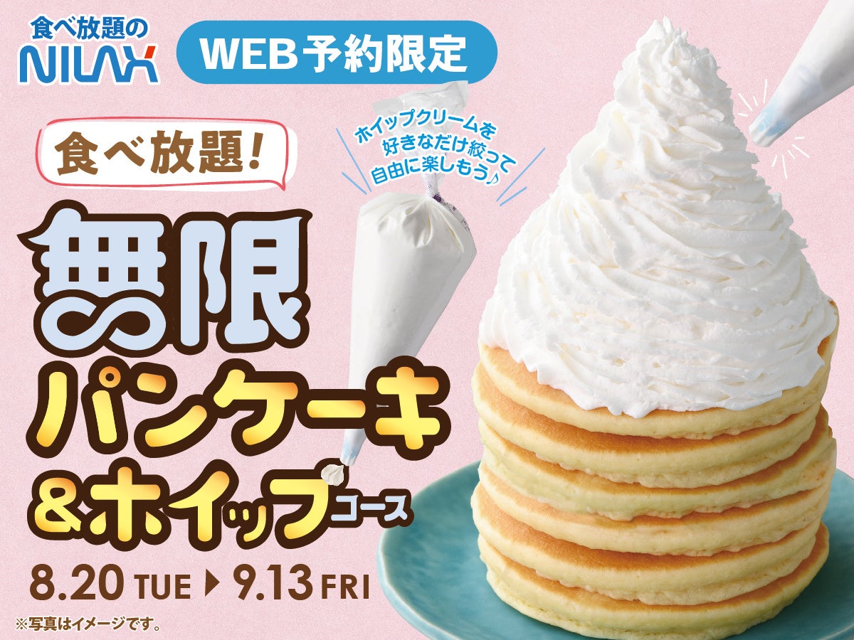 【大好評企画が帰ってきた!パンケーキ&ホイップ夢の食べ放題!】アレンジ無限大! 8/20~9/13の14時以降限定開催!ニラックスブッフェ36店舗にて『無限パンケーキ&ホイップコース』事前予約受付中!