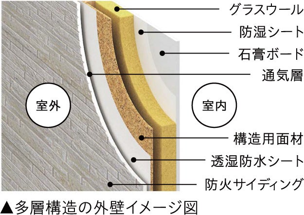 サイディングや構造用面材、通気層、グラスウール等で構成される多層構造により機密性・断熱性が高い外壁を実現。
