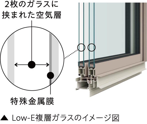 複層ガラスの内側にLow-E膜(熱伝導を抑える特殊金属膜)をコーティングした、高い断熱性と紫外線カット機能があるガラスを採用。