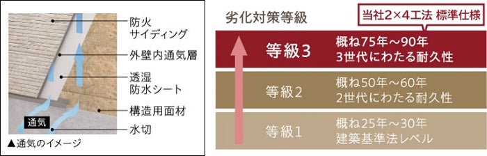 外壁には、壁内結露を防止するために、基礎上部から屋根裏まで通じる通気口を設置。土台には、製材工場で防腐・防蟻材を木材に浸透させた高耐久木材を採用し、コンクリートのベタ基礎によって白アリの侵入を防ぎます。