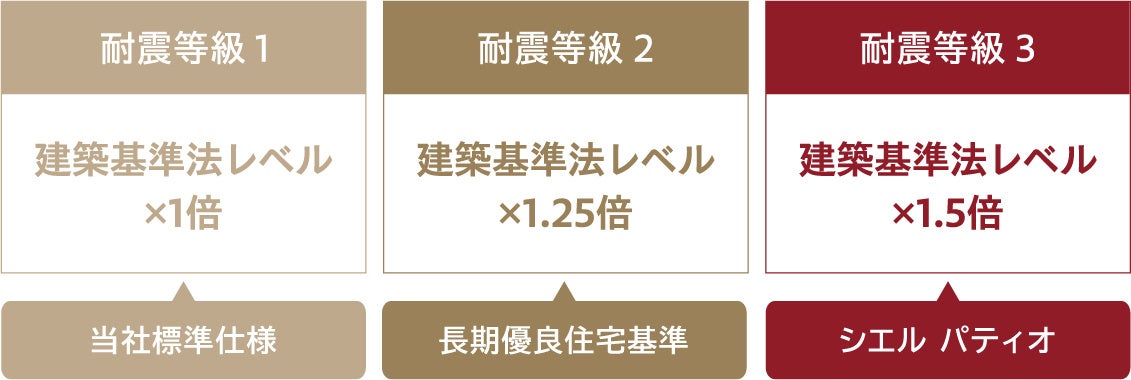 地震に対する構造躯体の倒壊・損傷のしにくさは、3段階で評価されます。建築基準法では、極めて稀な(100年に一度程度の)地震力に耐え得る性能を「耐震等級1」と定めており、長期優良住宅で求められる耐震基準は、その1.25倍に当たる「耐震等級2」です。「CIEL PATIO(シエルパティオ)」は、それらを上回る「耐震等級3」を満たす基準で設計されており、これは建築基準法の定める耐震基準の1.5倍に相当します。