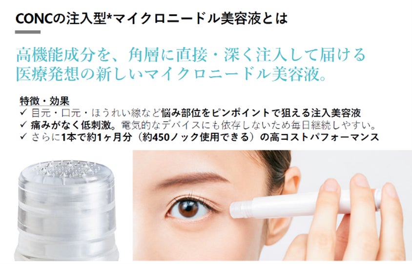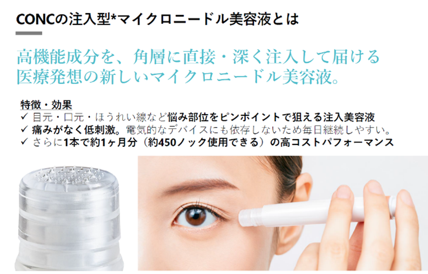 CONCが提案する注入型マイクロニードル美容液は、高機能成分を角層に直接、かつ深く届けることを目的としています。目元や口元、ほうれい線などの気になる部位にピンポイントでアプローチできます。