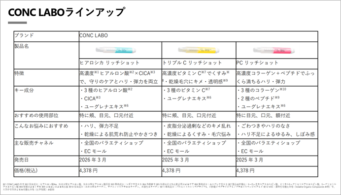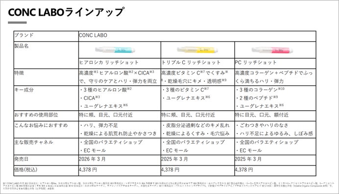 「CONC LABO」シリーズは、今後もテクノロジーに根付いた確かな成分と革新的なスタイルで、塗布するだけのスキンケアに加え、注入するスキンケアへという新しい価値提供を推進し、新たな市場価値の創出を目指していきます。