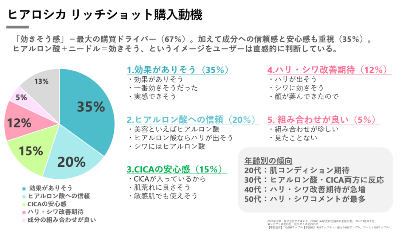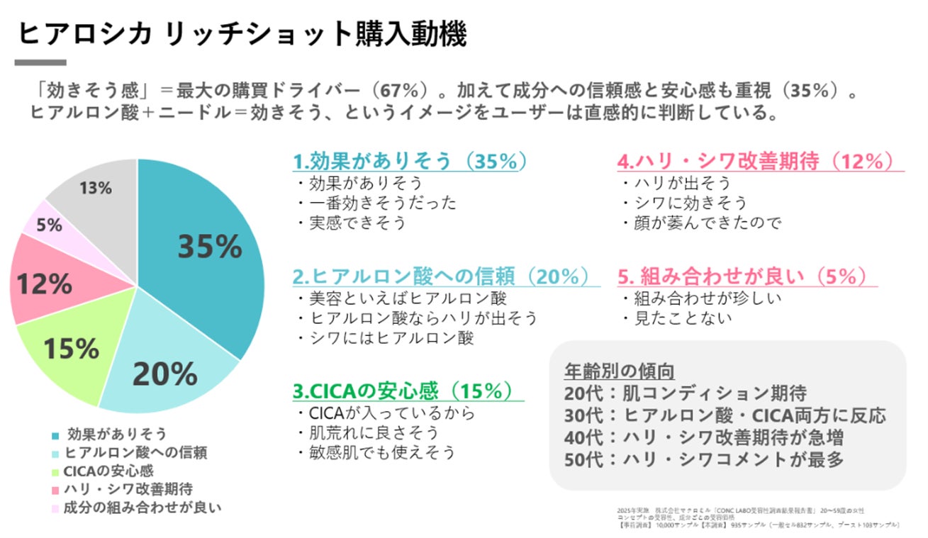 安藤:『ヒアルロン酸+ニードルで効きそう』『CICA配合で安心』といった直感的な期待と成分への信頼が、高い購買意欲に繋がっています。