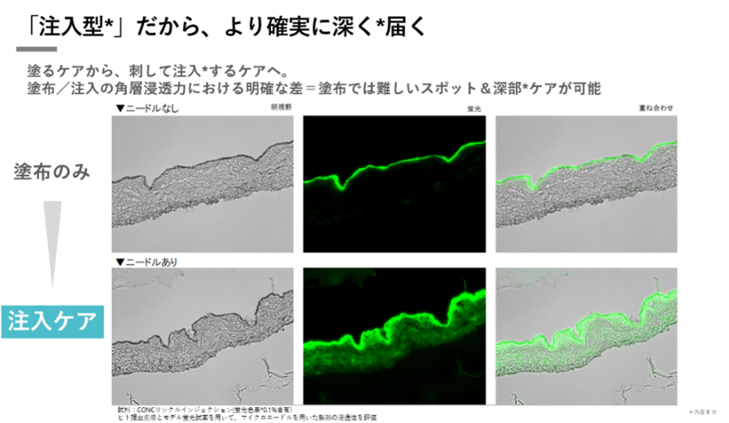 安藤:また、各層まで美容成分を注入することにより、従来の塗布型ケアと比較した場合、注入型ケアは角層への浸透力において明確な差があり、塗るだけでは難しい深部へのアプローチやスポットケアが可能となります。