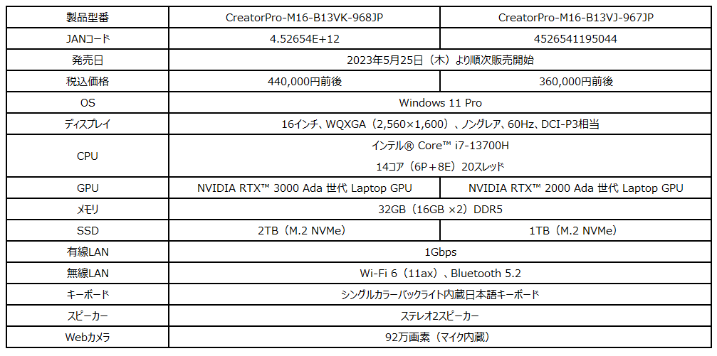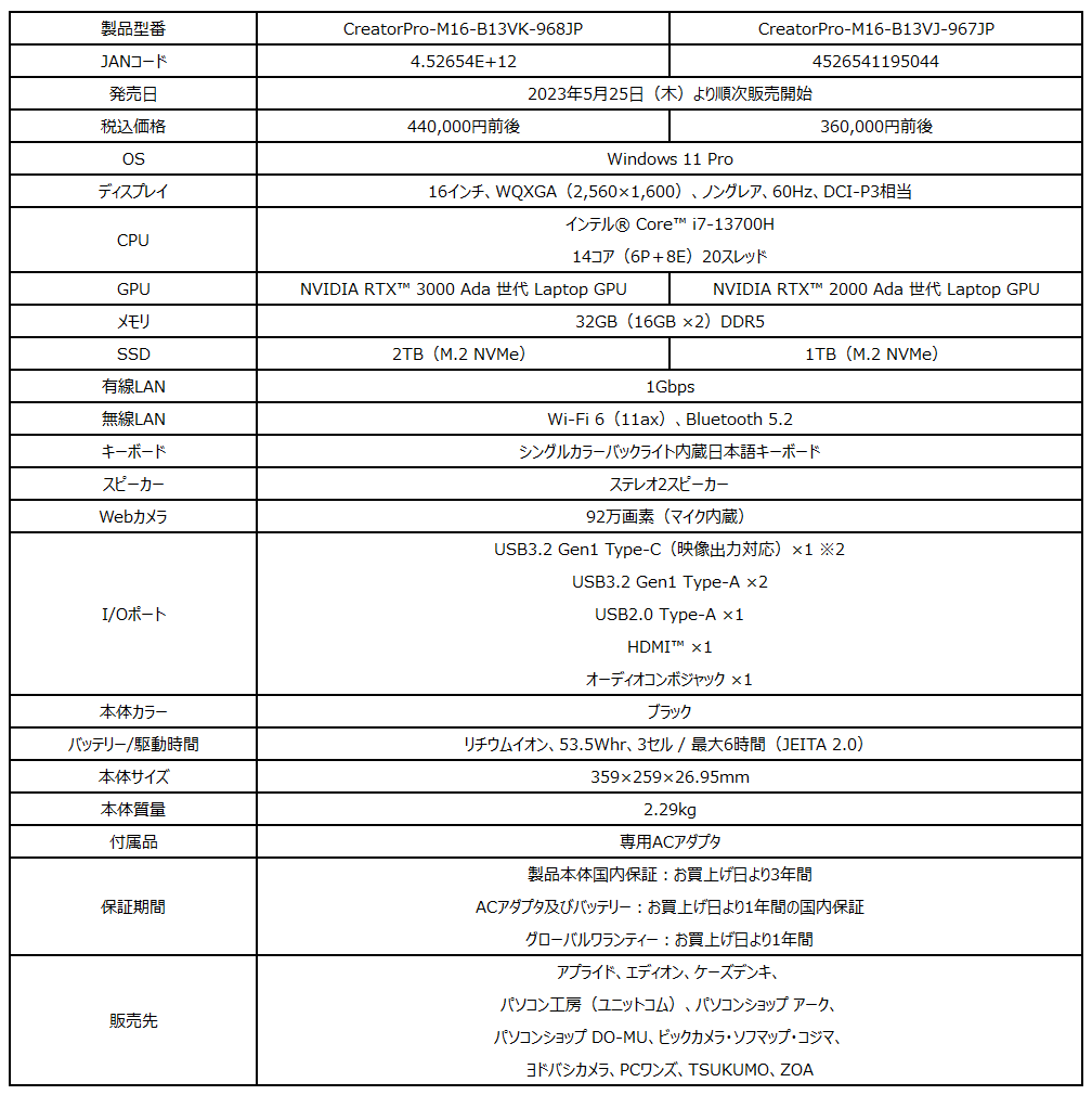 また、プロフェッショナル向けグラフィックス機能「NVIDIA RTX™ Ada 世代 Laptop GPU」を搭載したモバイルワークステーション「CreatorPro M16 B13V」シリーズも同時発売いたします。