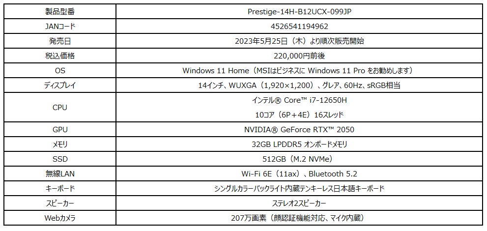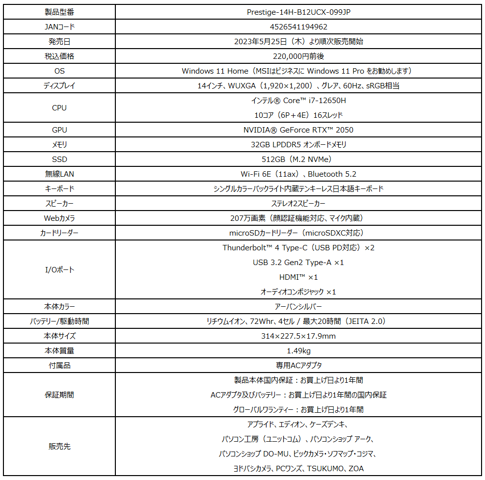薄さ17.9mm軽さ1.49kg「GeForce RTX™ 2050」搭載 ビジネス・クリエイターノートPC「Prestige 14 H B12U」シリーズ店頭販売モデル2023年5月25日(木)発売
