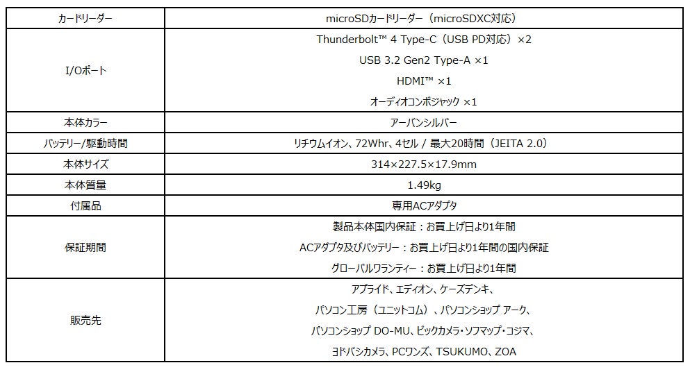 ノートPC本体は薄さ17.9mm・軽さ1.49kgでビジネスバッグやバックパックへ簡単に収納して持ち運ぶことができるコンパクトなデザインとなっています。本体カラーはクールでエレガントなアーバンシルバーを採用し、ビジネスシーンに溶け込む落ち着いたカラーリングとなっています。