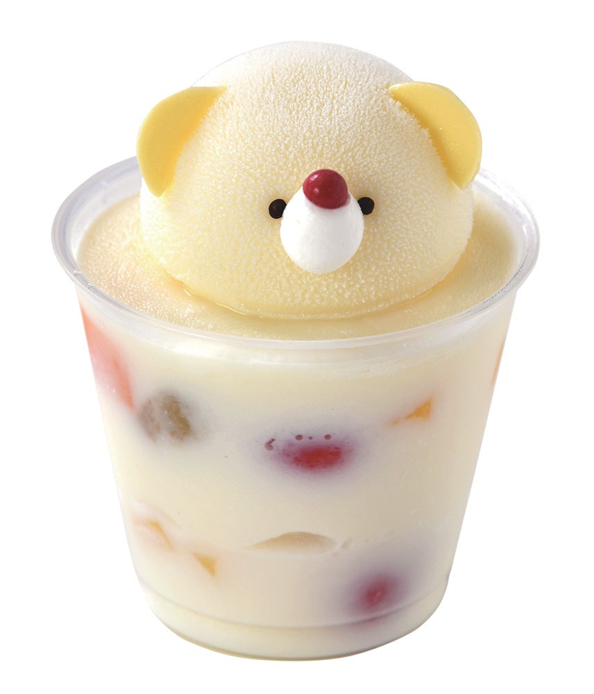 鹿児島の名産品である「しろくま」をヤナギムラオリジナルフローズンで見た目もかわいいくまの顔を乗せています。練乳たっぷりのフローズンの中には、みかん、もも、パイン、ぶどう、ブルーベリー、チェリーの6種類のフルーツを詰め込みました。