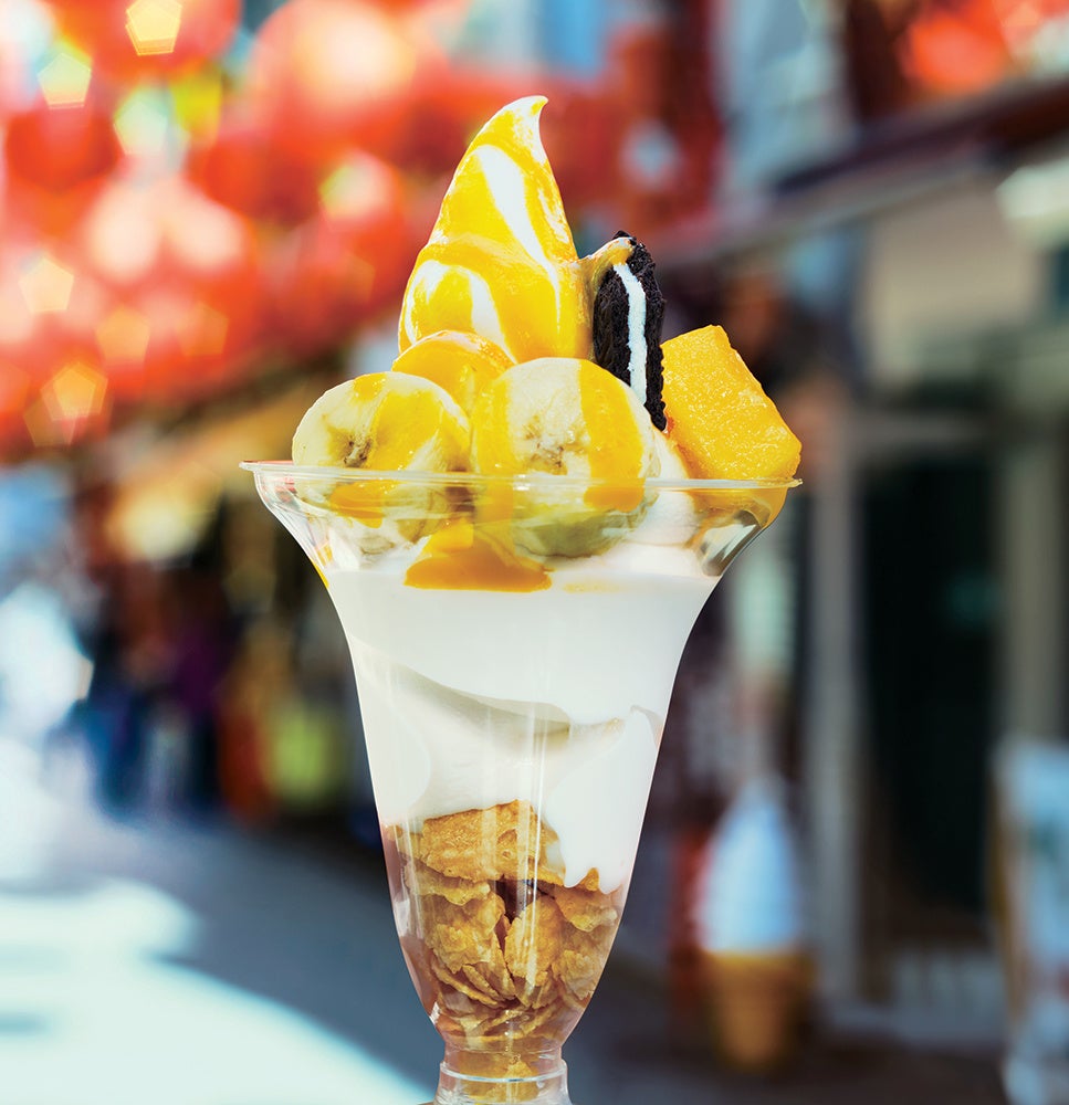 長崎県かもめ市場から、台湾点心・スウィーツで有名な〈老李〉で不動の人気を誇る杏仁ソフト。マンゴーとバナナの甘さと酸味のバランスが絶妙。