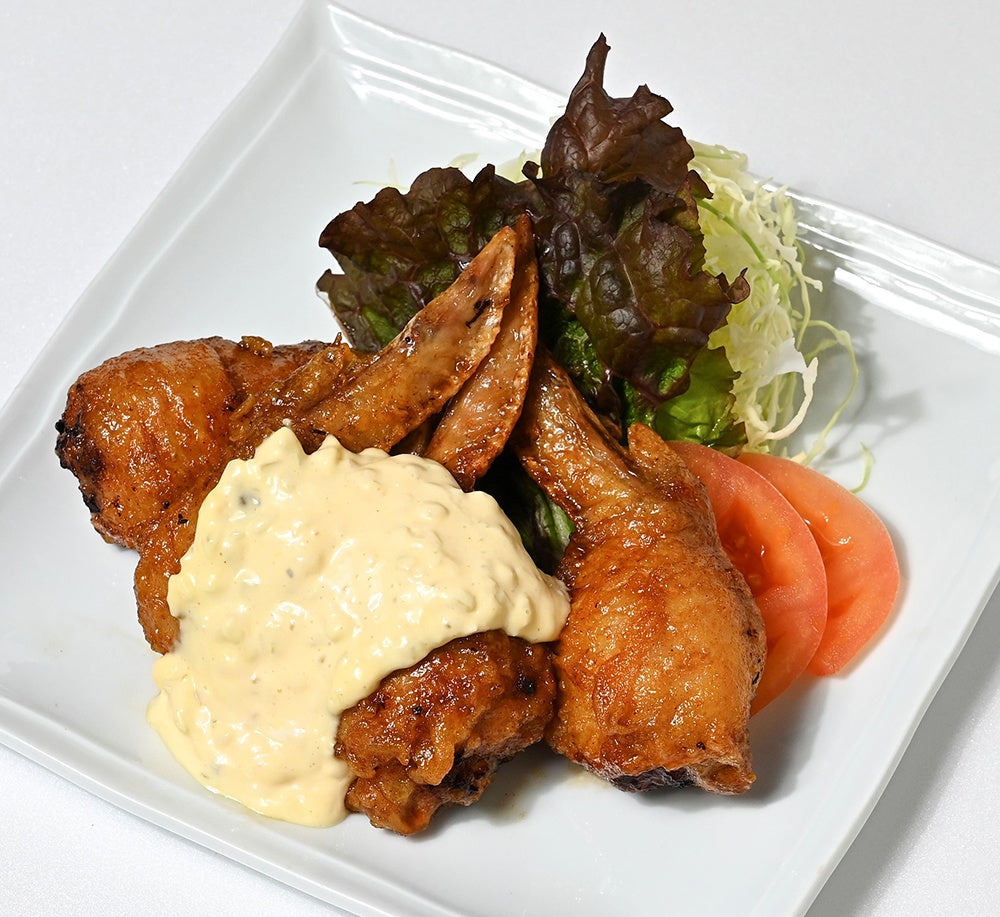 〈餃子の馬渡〉自慢の人気商品「手羽餃子」に馬渡特製こだわり餃子餡をギュッと詰め込みました。タルタルソースをたっぷりと。