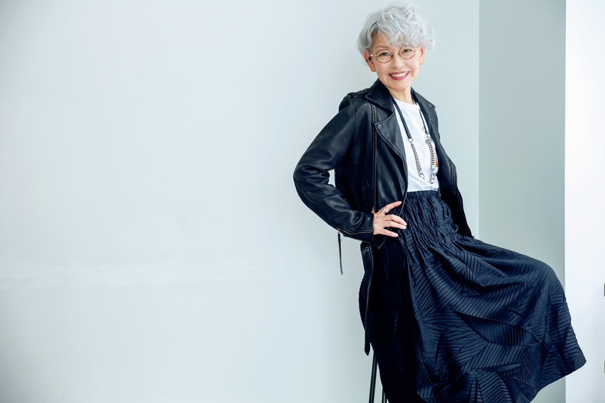 また、グレイヘアにヘアスタイルを変えたことで、シニアモデル・音楽活動など活躍の場を広げた野田ユカさんなど、魅力あふれる大人たちの着こなしを多数紹介しています。野田ユカさんが着ているレザージャケットは、セレクトショップ「クアドラート」で初めて買った一枚。あえてふわりとしたシルエットのスカートにハードな革のアウターを合わせて辛口に。