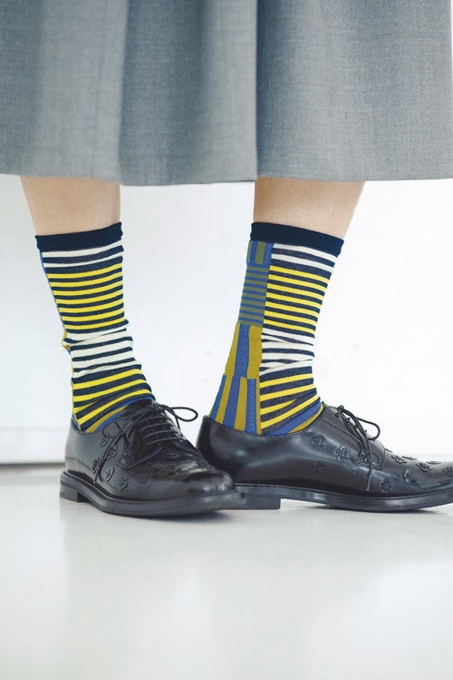 靴下は「NUNO」のテキスタイルの柄を使って、「アンティパスト」とコラボして作ったもの。このほかにも、『大人になったら、着たい服24-25秋冬』には、さまざまなアイテムやコーディネートを掲載。