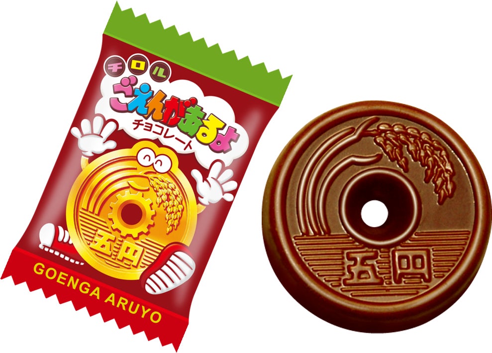「ごえんがあるよ」は1984年に誕生。5円玉形が特徴のお菓子。パッケージのキャラクターは“ごえんくん”。パッケージによってごえんくんのポーズが違うのもポイント!発売から40年以上愛される商品です。
