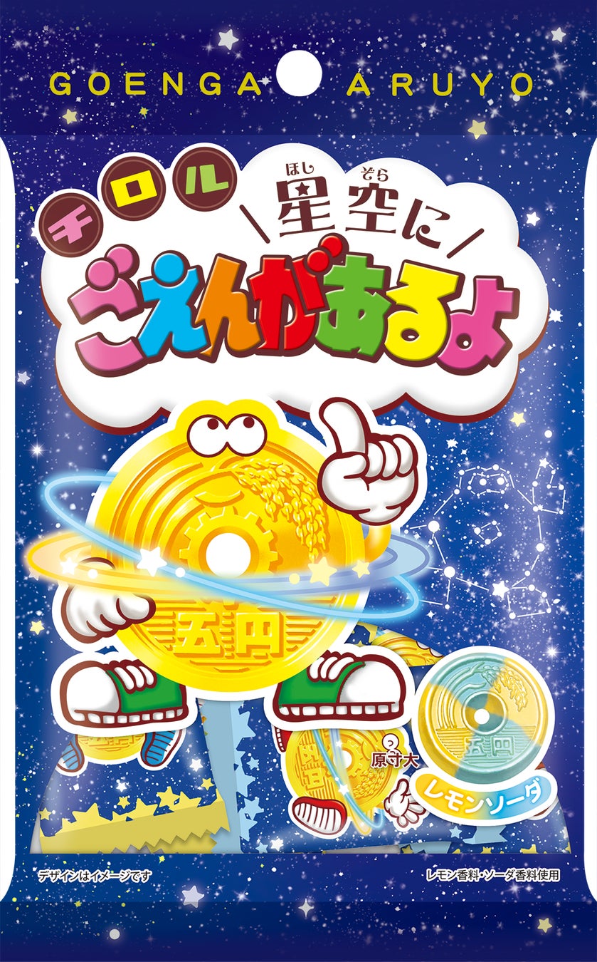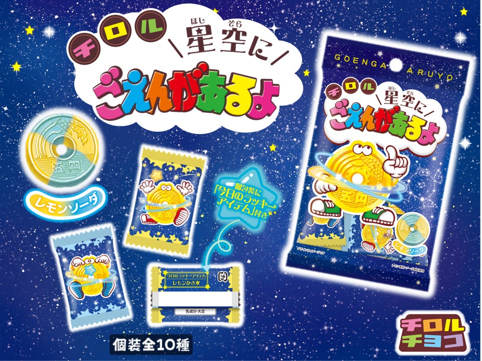 ロングセラー商品の“ごえんがあるよ”がレモンソーダ味で登場!この季節にピッタリな爽やかな味わいでパクパク食べれます。パッケージは星空をイメージしたデザインで、個包装の裏面には「今日のラッキーアイテム」付き!パッケージも楽しみながら食べることが出来ます。