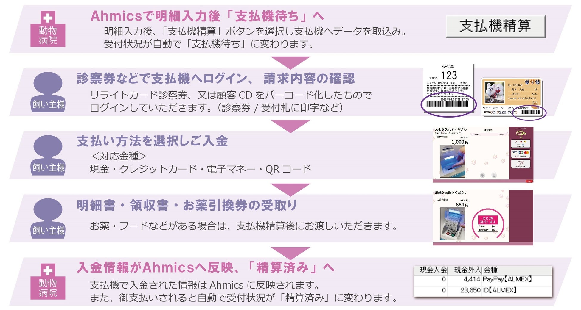 近年ではクリニックや調剤薬局向けにスリムな小型自動精算機『FIT-A』を展開しております。このたび、他の医療施設と同様の課題を抱える動物病院様に向けて、業界で高い実績のある『Ahmics V4 Advance』と連携した新たな『FIT-A』をペットコミュニケーションズと共同で開発しました。従来の自動精算機に比べ、薄型で省スペース化を実現し、フルキャッシュレス対応によりスムーズな会計が可能となります。