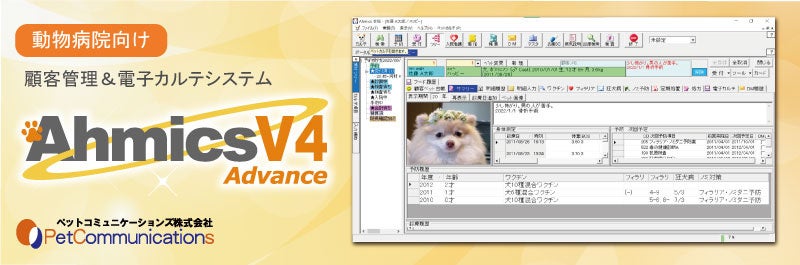 ペットコミュニケーションズは、動物病院向けに経営管理基幹システム『Ahmics V4 Advance』を提供しています。動物病院の「受付の効率化」「待ち時間の低減」と合わせ、顧客フォローにつながる「DM管理」、経営支援につながる「会計処理」、ペーパーレス管理まで可能な「電子カルテ」までトータルで管理可能なシステムです。また、複数病院間でのデータベース一元化による情報共有、より的確な診療説明や理解が可能となる診療履歴管理、画像管理など、動物病院自身の顧客満足向上と医療技術力の向上をICT活用により実現します。