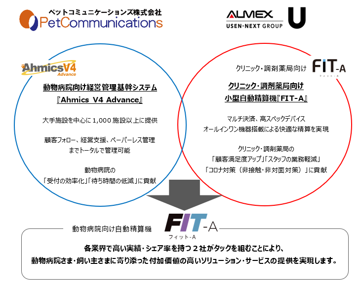 株式会社USEN-NEXT HOLDINGS(本社:東京都品川区、代表取締役社長 CEO:宇野 康秀)のグループ会社である株式会社アルメックス(本社:東京都品川区、代表取締役社長:馬淵 将平、以下、アルメックス)とペットコミュニケーションズ株式会社(本社:大阪府大阪市中央区、代表取締役社長:南埜 紀雄、以下、ペットコミュニケーションズ)は、経営管理基幹システム『Ahmics V4 Advance(アーミックス V4 アドバンス)』と連携した自動精算機『FIT-A(フィット エー)』の提供を本日9月27日より開始しました。『FIT-A』は、動物病院における会計業務の効率化や窓口混雑緩和を目的に両社で共同開発を行い、動物病院向けにカスタマイズした自動精算機です。
