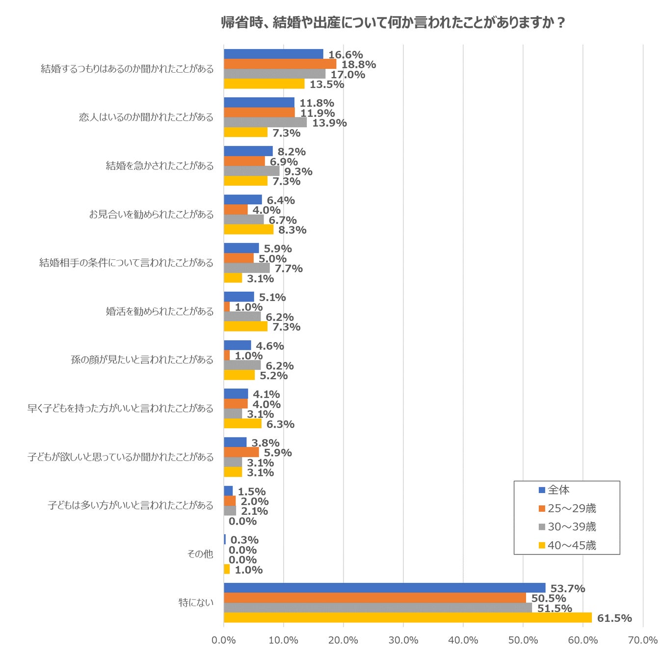 年末年始やお盆に帰省したとき、親や親戚から結婚や出産についてあれこれ言われた、という人は少なくないのではないでしょうか。未婚の男女を対象に、帰省した際に親や親戚から結婚・出産について何か言われたことがあるか聞いてみました。