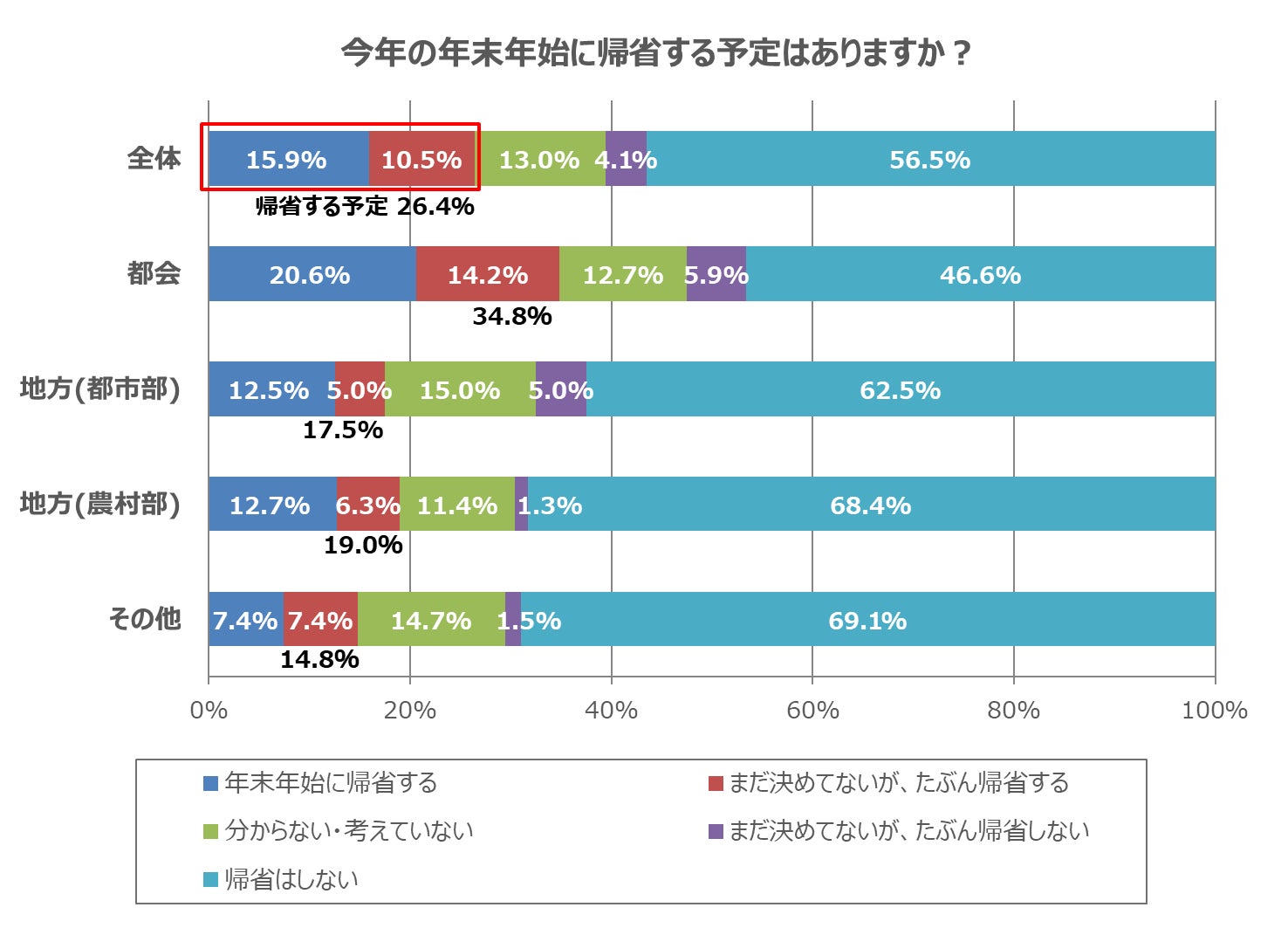 ■年末年始に帰省予定の未婚男女は26.4%、都会に住む人は34.8%