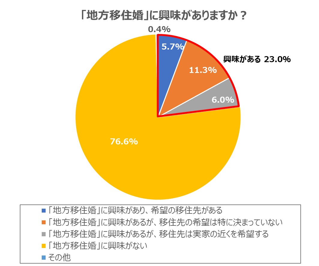 「興味があり、希望の移住先がある」は5.7%、「興味があるが、移住先の希望は特に決まっていない」は11.3%、「興味があるが、移住先は実家の近くを希望する」は6.0%で、計23.0%の人が「地方移住婚に興味がある」と回答しました。