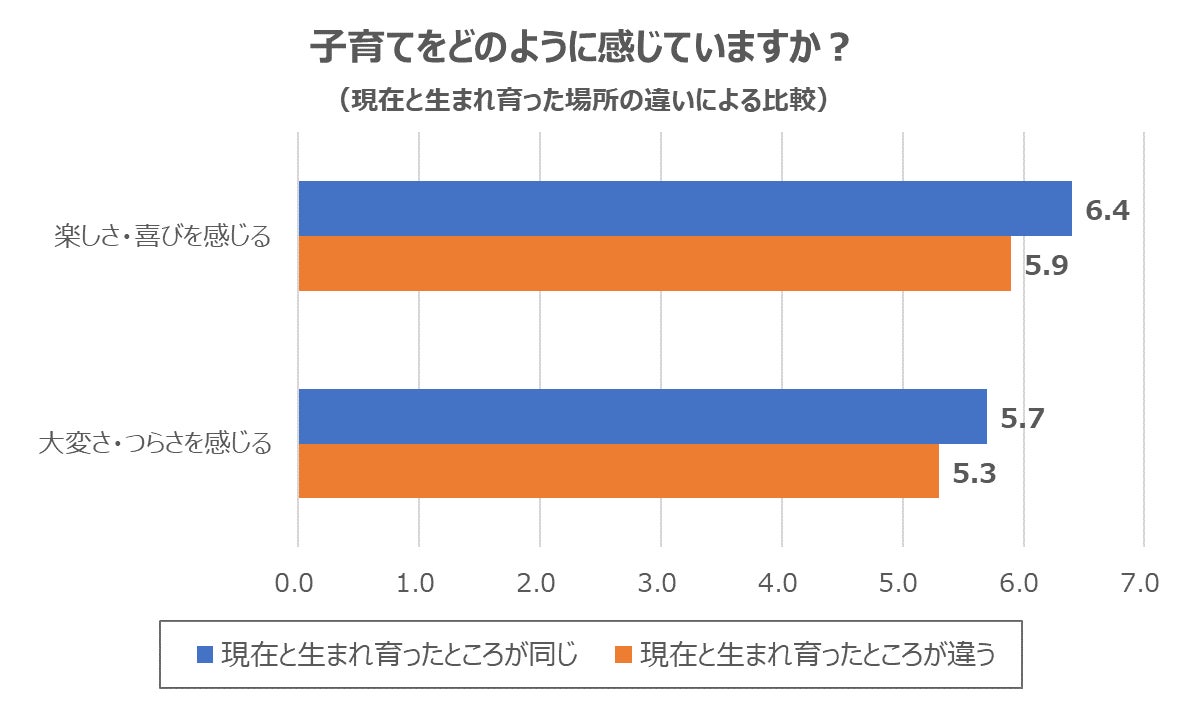 また、現在住んでいるところと生まれ育ったところが同じ人、それぞれが異なる人で比較したところ、「楽しさ・喜び」については前者が平均6.4点で、後者の平均5.9点より0.5ポイント高い結果となりました。「大変さ・つらさ」については、前者が平均5.7点で、後者は平均5.3点でした。実家の近くなど“地元”で子育てをしている人、あるいは“地元”に近い環境で子育てをしている人の方が、「楽しさ・喜び」を感じているようです。