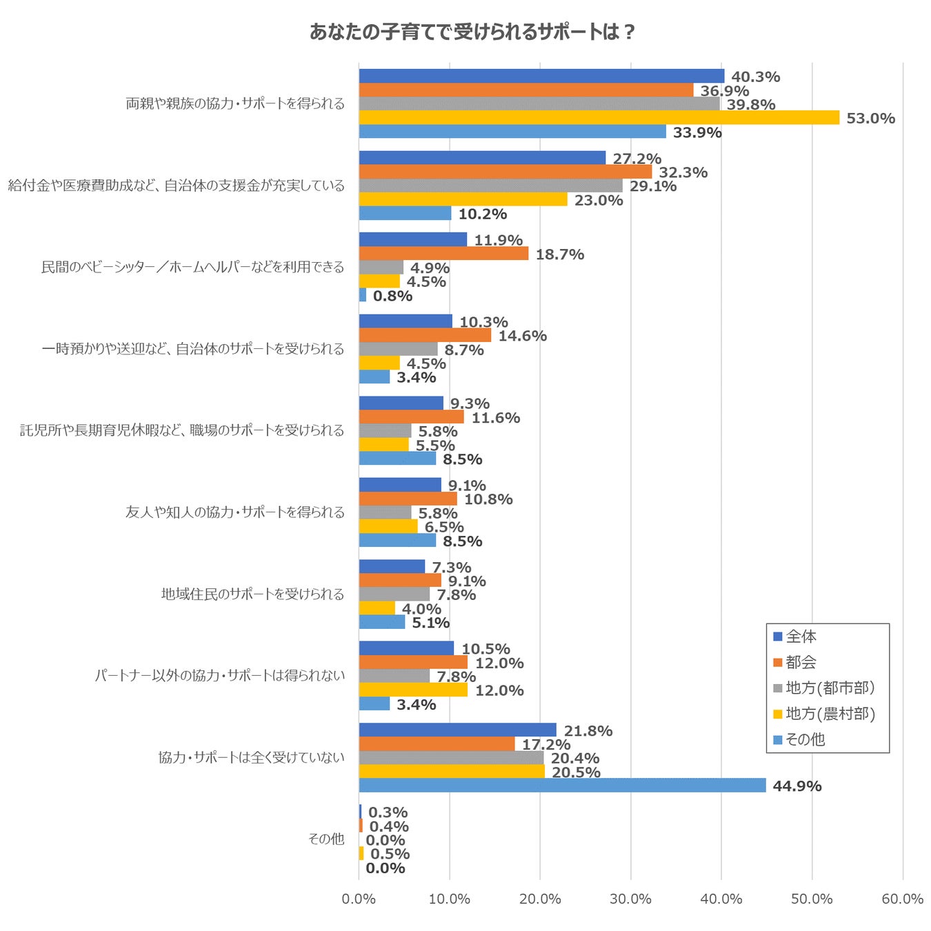 子育てにおいて受けられるサポートで最も多かったのは、「両親や親族の協力・サポート」(40.3%)でした。これに、「自治体の支援金が充実している」(27.2%)、「民間のベビーシッター/ホームヘルパー」(11.9%)が続いています。「両親や親族の協力・サポート」はどの地域でもトップになりましたが、特に地方の農村部(53.0%)はその割合が高く、都会(36.9%)、地方の都市部(39.8%)を10ポイント以上、上回っていました。都会では、「自治体の支援金が充実している」(32.3%)、「民間のベビーシッター/ホームヘルパー」(18.7%)、「自治体のサポート」(14.6%)、「職場のサポート」(11.6%)が他の地域に比べて高くなっています。
