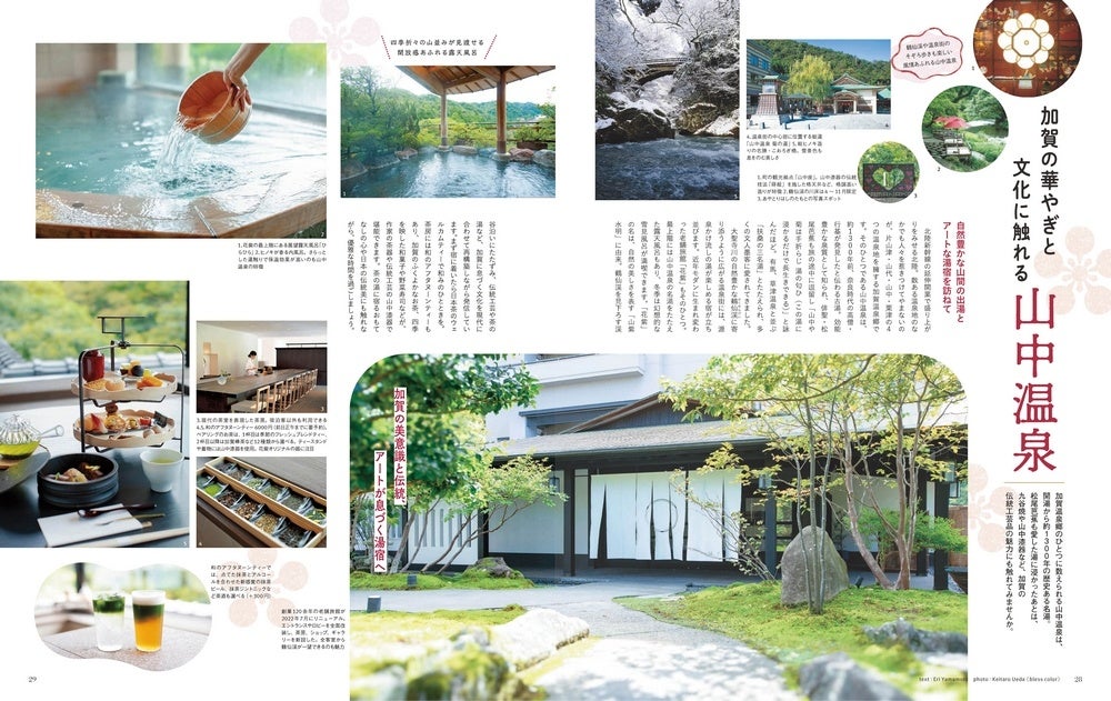 ◆北陸新幹線の延伸開業で盛り上がりをみせる北陸。数ある温泉地のなかでも人々を惹きつけてやまないのが片山津・山代・山中・栗津の4つの温泉地を擁する加賀温泉郷、そのひとつである山中温泉は約1300年前、奈良時代の高僧・行基が発見したと伝わる古湯。松尾芭蕉も愛した湯に浸かったあとは、茶の湯や和菓子、野菜寿司を堪能しつつ、九谷焼や山中漆器など、加賀の伝統工芸品の魅力にも触れあって。(山中温泉)