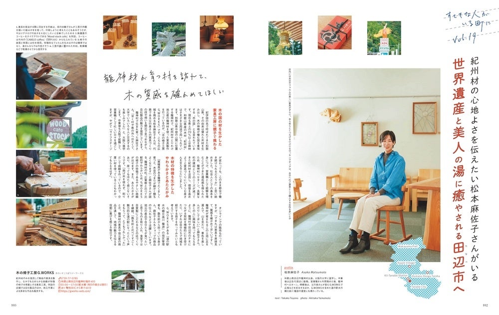 ◆レギュラーコーナーでは、東京・両国、京都・八坂通を紹介、「すてきな人がいる町に」では、世界遺産と日本三美人の湯もある和歌山県・田辺市で、紀州材の心地よさを伝えたいと父親が代表を務める家具工房の広報活動に携わる松本麻佐子さんに注目。