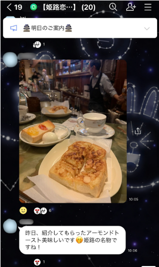 スタッフが同行しない自由散策の時間を設け、行ってきた場所、食べたいものの共有など親密度を高めるためのオープンチャットを活用しました。非対面なので、初めてお会いする方とのコミュニケーションの手助けとなり、2次会のお誘いなども気軽に行っていただきました。