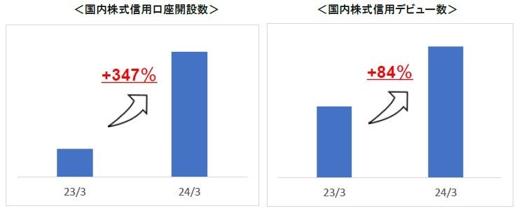 直近では、2023年8月に株式の取引経験がない方でもリスクを抑えて信用取引ができる「はじめて信用®」を開始しました。サービス開始8ヵ月で口座開設数26万口座と多くのお客さまにご利用いただいており、1年前と比較して国内株式信用口座開設数が+347%、国内株式信用デビュー数(当社で初めて信用取引をされたお客さま)が+84%と大幅に増加しました。