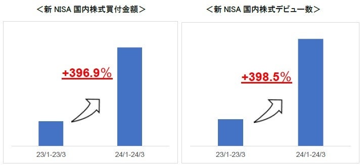 2024年1月からは新しいNISAも始まり、2024年1月~3月の新NISA口座における国内株式買付金額は、前年2023年1月~3月と比較して+396%と急増し、新NISAをきっかけに多くのお客さまが当社の商品・サービスを通じて資産形成をスタートしています。